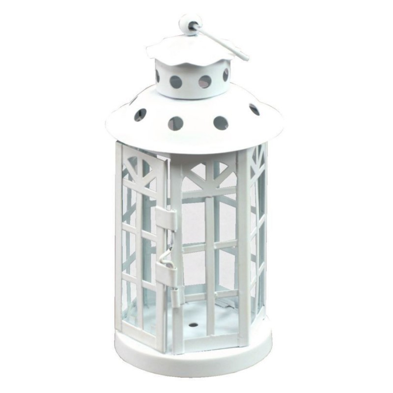 Lanterna portacandela esagonale in metallo decorata con finestre ad arco, ideale anche come bomboniera o segnaposto.
